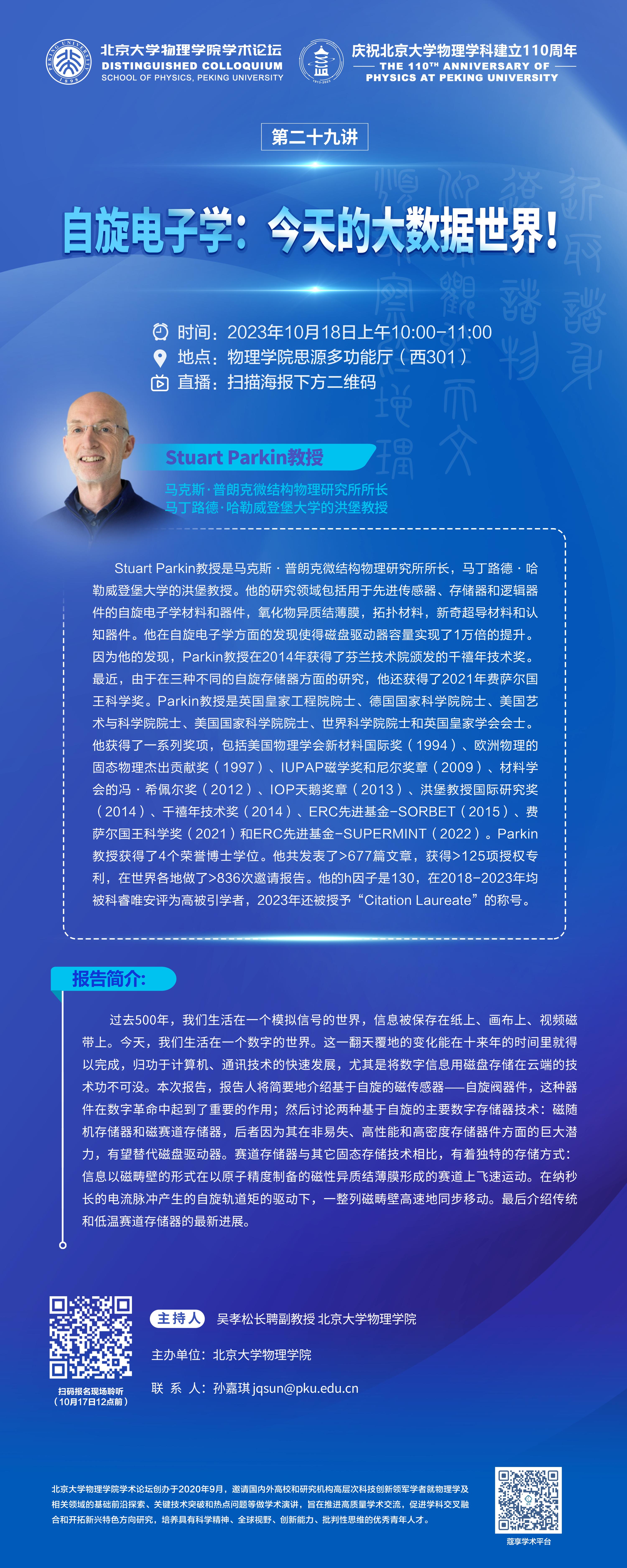 Stuart Parkin教授是马克斯·普朗克微结构物理研究所所长,马丁路德·哈勒威登堡大学的洪堡教授。他的研究领域包括用于先进传感器、存储器和逻辑器件的自旋电子学材料和器件,氧化物异质结薄膜,拓扑材料,新奇超导材料和认知器件。他在自旋电子学方面的发现使得磁盘驱动器容量实现了1万倍的提升。因为他的发现,Parkin教授在2014年获得了芬兰技术院颁发的千禧年技术奖。最近,由于在三种不同的自旋存储器方面的研究,他还获得了2021年费萨尔国王科学奖。Parkin教授是英国皇家工程院院士、德国国家科学院院士、美国艺术与科学院院士、美国国家科学院院士、世界科学院院士和英国皇家学会会士。他获得了一系列奖项,包括美国物理学会新材料国际奖(1994)、欧洲物理的固态物理杰出贡献奖(1997)、IUPAP磁学奖和尼尔奖章(2009)、材料学会的冯·希佩尔奖(2012)、IOP天鹅奖章(2013)、洪堡教授国际研究奖(2014)、千禧年技术奖(2014)、ERC先进基金-SORBET(2015)、费萨尔国王科学奖(2021)和ERC先进基金-SUPERMINT(2022)。Parkin教授获得了4个荣誉博士学位。他共发表了>677篇文章,获得>125项授权专利,在世界各地做了>836次邀请报告。他的h因子是130,在2018-2023年均被科睿唯安评为高被引学者,2023年还被授予“Citation Laureate”的称号。