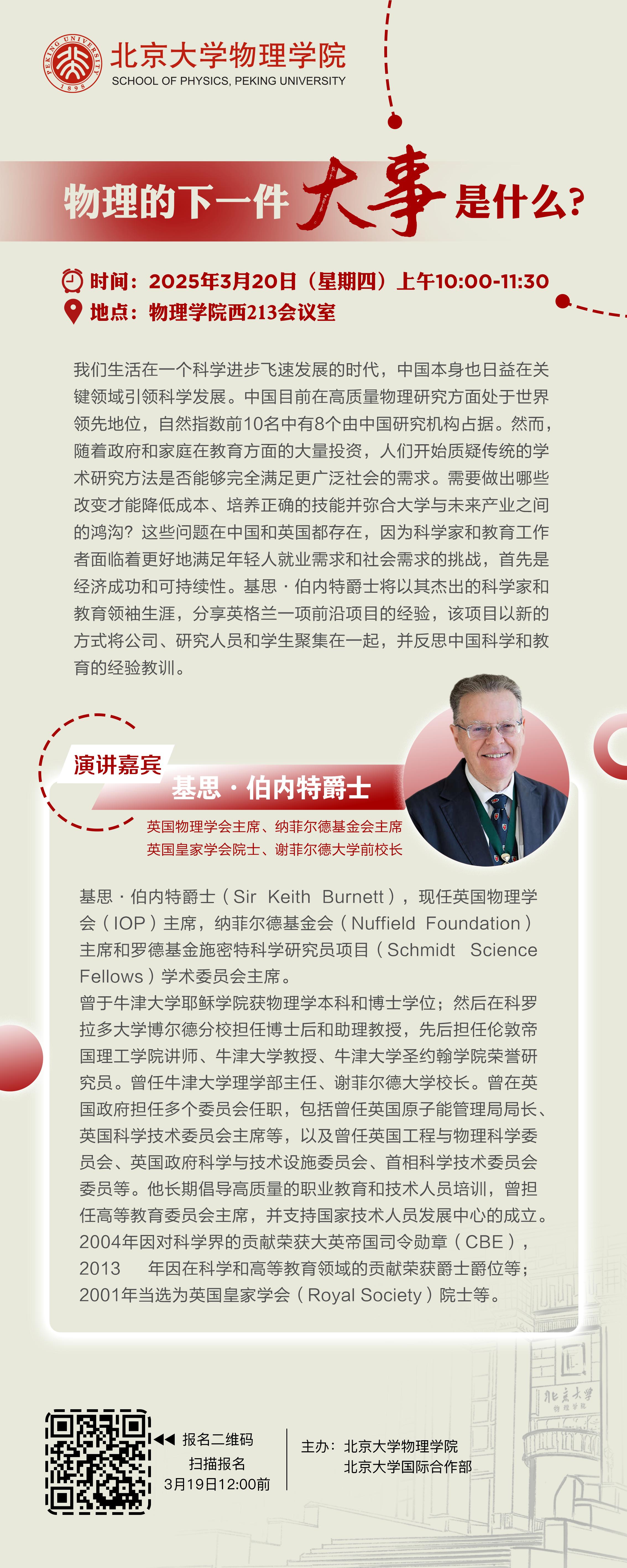 我们生活在一个科学进步飞速发展的时代,中国本身也日益在关键领域引领科学发展。中国目前在高质量物理研究方面处于世界领先地位,自然指数前10名中有8个由中国研究机构占据。然而,随着政府和家庭在教育方面的大量投资,人们开始质疑传统的学术研究方法是否能够完全满足更广泛社会的需求。需要做出哪些改变才能降低成本、培养正确的技能并弥合大学与未来产业之间的鸿沟?这些问题在中国和英国都存在,因为科学家和教育工作者面临着更好地满足年轻人就业需求和社会需求的挑战,首先是经济成功和可持续性。基思·伯内特爵士将以其杰出的科学家和教育领袖生涯,分享英格兰一项前沿项目的经验,该项目以新的方式将公司、研究人员和学生聚集在一起,并反思中国科学和教育的经验教训。