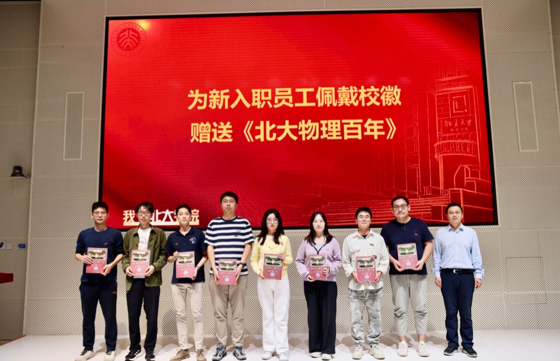 最后,肖云峰院长为新员工代表佩戴校徽并赠送《北大物理百年》。