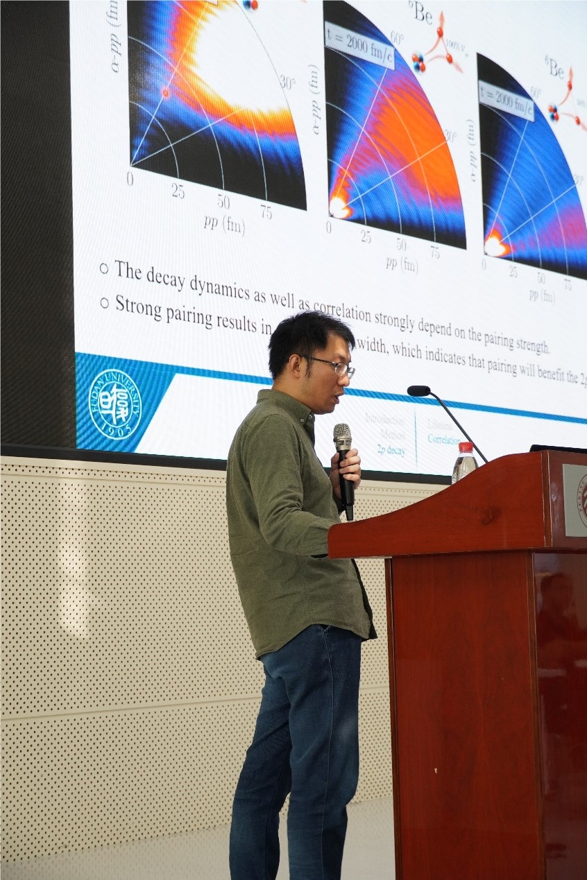 王老师向参会者深入浅出地介绍了三体衰变的物理背景和研究现状,特别是基于Berggren波函数的原子核结构计算,使我们能够研究三体构型及其随时间的演化,进而在长程上得到与衰变发生有关的物理信息。在就特定原子核(例如45Fe和6Be等)的计算结果进行阐述之后,王老师和与会者展开了亲切的讨论。