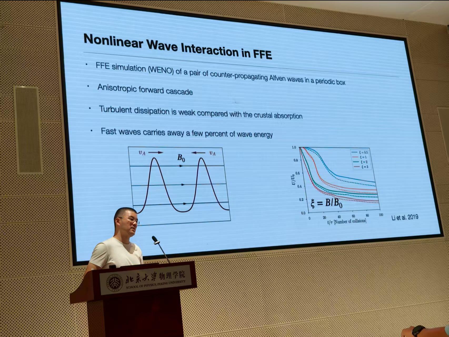 接下来,李老师围绕三个问题介绍了对磁星的具体研究,这三个问题是:(1)如何扭曲磁星磁层;(2)磁能如何耗散;(3)具体如何辐射。为了让同学们理解磁星磁能转化和相应的辐射过程,李老师对中子星磁层作了基本的理论介绍,包括其“无力”的特性,以及其中阿尔文波和快波的传播与相互作用。通过一系列理论计算和数值模拟的结果,李老师向大家展示了中子星壳层塑性流动对磁场的扭曲、阿尔文波到快波的转化、以及量子电动力学过程对辐射的影响。